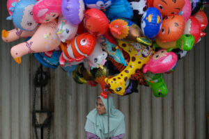 Penjual balon menunggu pembeli di Jakarta saat Muslim Indonesia melaksanakan shalat Idul Fitri pada 31 Maret 2025. (Foto: AFP)