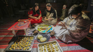 Sebuah keluarga di Basra, Irak, menyiapkan kue kering lebaran. (Foto: AP)