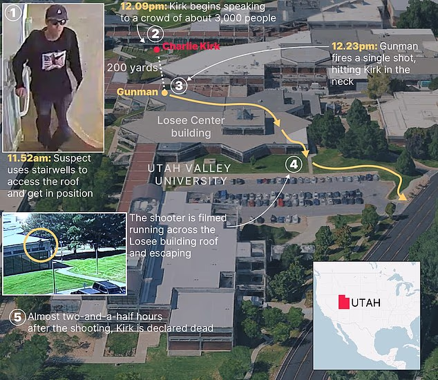 Menurut keterangan FBI dan pejabat setempat, pelaku tiba di lokasi hanya beberapa menit sebelum kejadian. Kamera pengawas merekam sosok tersebut menaiki tangga menuju atap salah satu gedung di dekat area acara, lalu melepaskan satu tembakan yang menewaskan Kirk seketika.